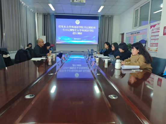 座谈会上,全体人员先共同观看塔里木大学宣传视频,了解学校办学优势与发展理念。随后,胡松林介绍了塔里木大学外国语学院的学科布局、师资结构及外语人才培养实践。林冬梅副院长回应介绍喀什大学外国语学院的发展历程、学科定位与教学科研亮点,交流了课程优化、特色专业建设的实践心得。