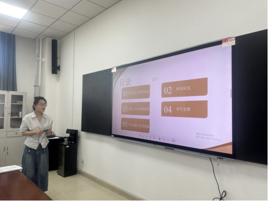 会上,秦佳辛从专业定位与培养目标、师资队伍、课堂与教学资源建设、学生发展、存在问题与改进措施五个方面进行汇报。