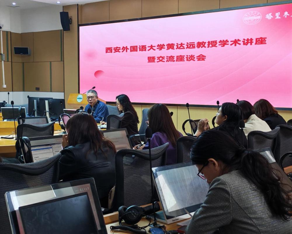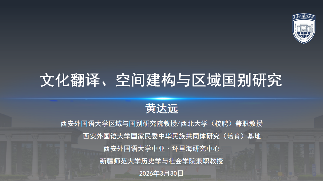 为深化区域国别研究学科建设,推动学术交流与人才培养,3月30日下午,塔里木大学外国语学院主办的“丝路国别系列讲坛”在外语楼304室顺利开讲。本次讲坛特邀西安外国语大学国家民委(培育)基地首席专家黄达远教授,带来题为《文化翻译、空间建构与区域国别研究》的精彩学术分享,为师生带来一场兼具理论深度与现实意义的学术盛宴。